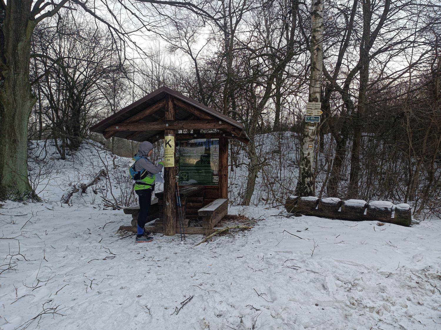 S Václavem jsme to vyřešili výstupem přímo vzhůru po nějaké lesácké traktorocestě, zatímco Pavel blížící se z povzdálí se kousek vrátil a našel si cestu svoji. Lezli jsme docela hlubokým sněhem a byl jsem rád, že jdu ve vysokých zimních botách, jinak už bych mrznul v ponožkách plných sněhu. Husáka i s jeho kontrolním bodem jsme překonali někdy chvíli před 13 h. Už cestou nahoru Václav nadhodil, že by byl rád v cíli do 15h, já jsem se snažil své plány mírnit po zkušenostech z minula, kdy byl celej kopec jedno velký utrpení a doufal jsem tak v 15:10, nicméně teď jsme byli nahoře, já byl v pohodě, počasí nám přálo, tak nebyl důvod to trochu nerozběhnout a nezmuflonit dolů. Do Jevíčka to bylo 7 km a dál asi 4 a půl.